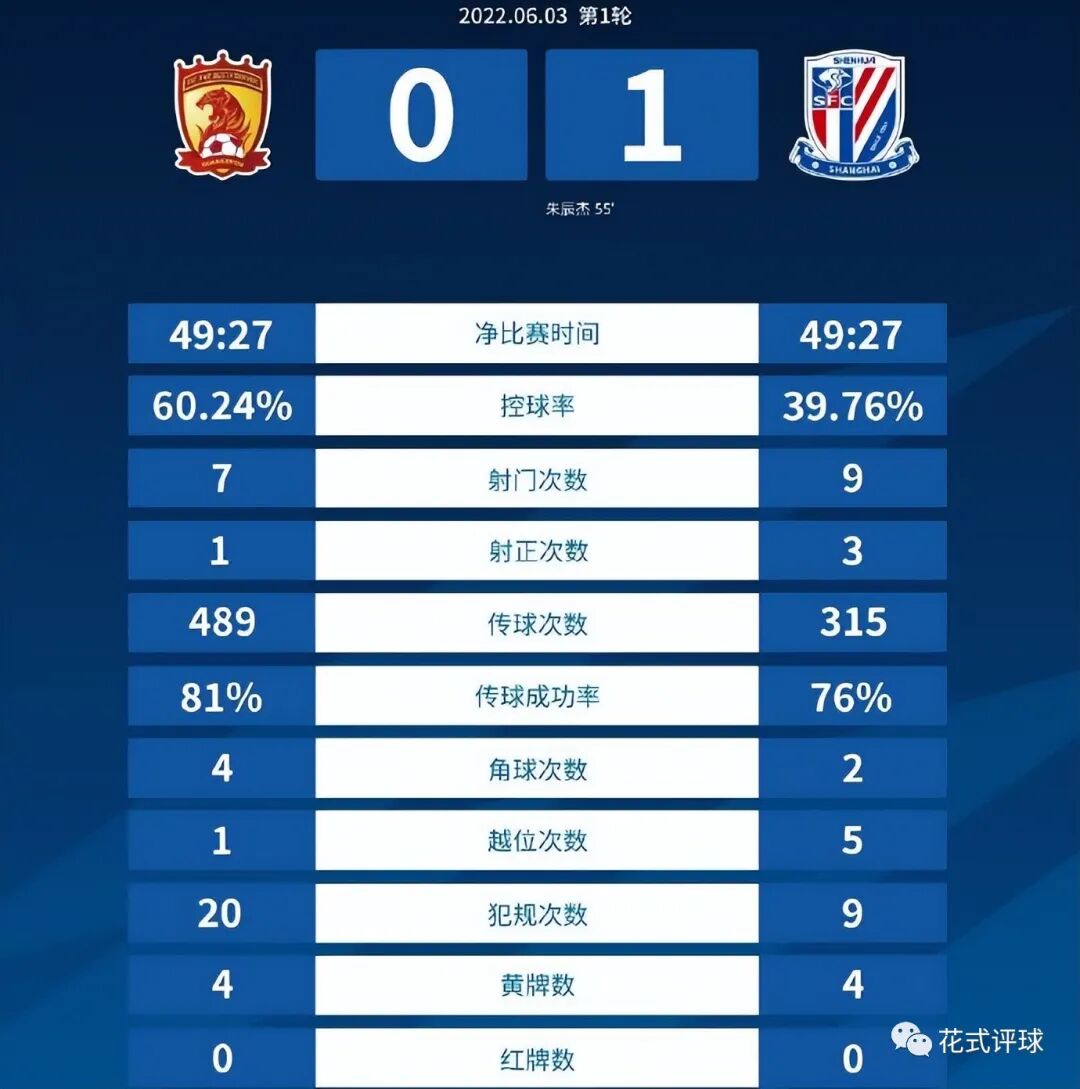 第一控球率:广州队的控球率是60.24%,而申花是39.76%,算是6-4开。