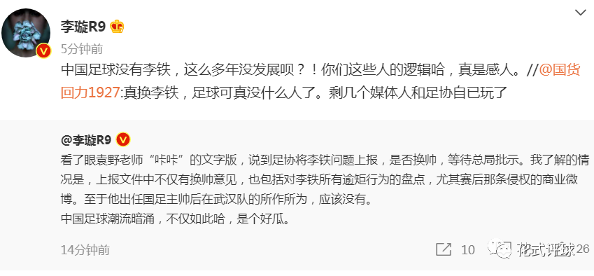 据足球报国内部主任李璇的爆料(上图),“上报文件中不仅有换帅意见,也包括对李铁所有逾矩行为的盘点,尤其赛后那条侵权的商业微博。至于他出任国足主帅后在武汉队的所作所为,应该没有。”