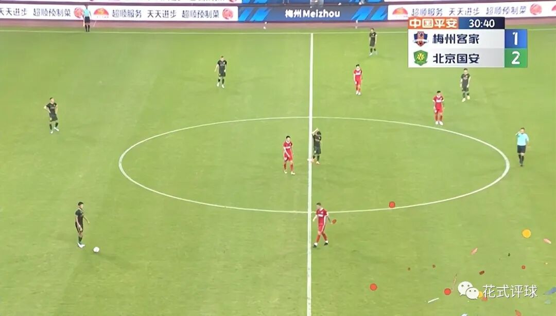 此时双方的比分变为:国安2比1梅州客家。丢球后,国安的进攻反而变得不积极,频繁在后场倒脚让人看不懂,尤其是第29分钟后的一幕。