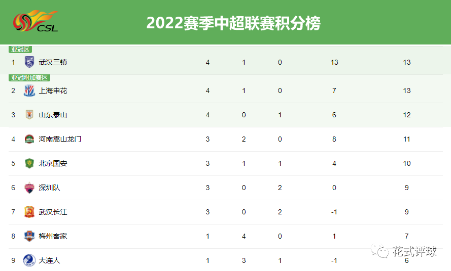 再看前5轮过后的积分榜(上图),争冠集团已经浮出水面。以升班马的身份高居积分榜榜首,武汉三镇是本赛季的最大意外!除了武汉三镇,还有跟武汉三镇同积13分的上海申花、山东泰山、河南嵩山龙门和北京国安。这5支球队都具备争冠实力。