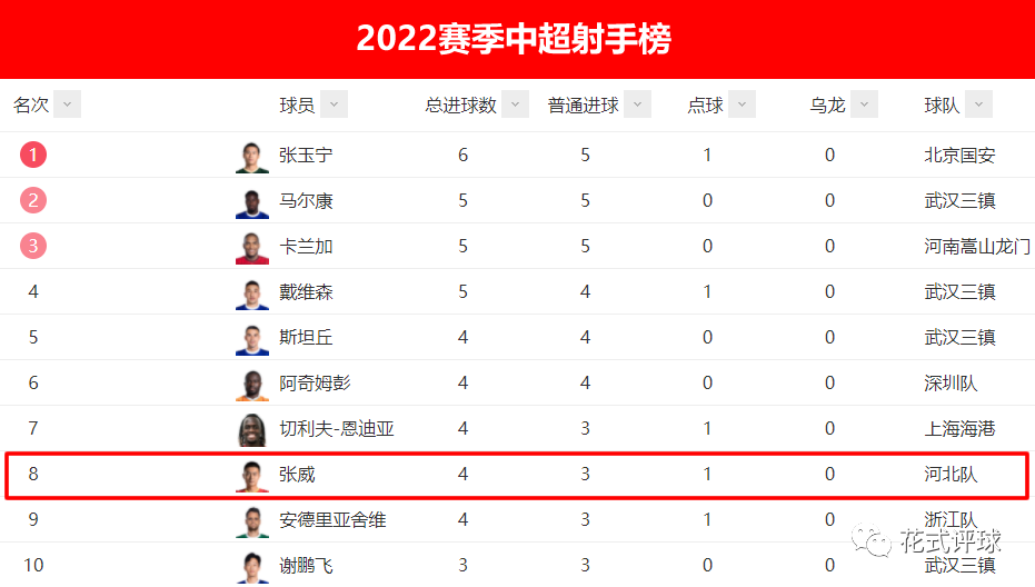 在射手榜上,张玉宁继续以6球高居榜首,进4球的张威跃居第8,是本土球员中进球第二多的。