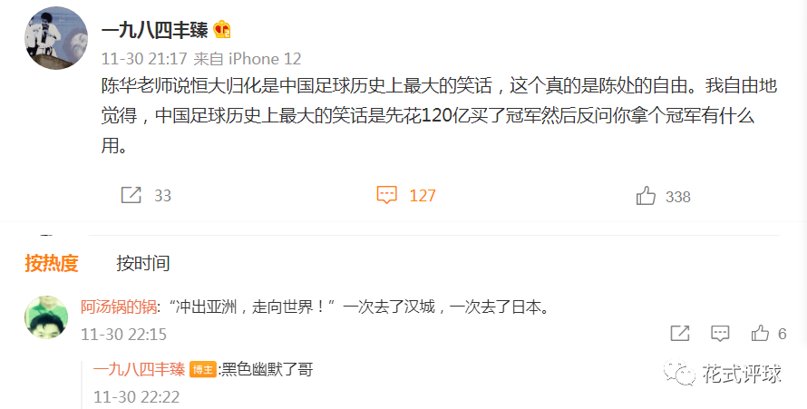 谈到有记者表示恒大归化是中国足球历史上最大的笑话时,丰臻回应道:“我自由地觉得,中国足球历史上最大的笑话是先花120亿买了冠军然后反问你拿个冠军有什么用。”