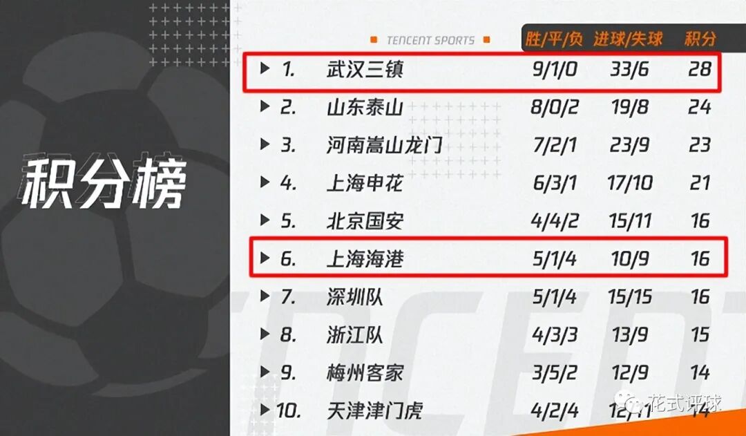第一阶段的比赛结束后,武汉三镇以28分高居积分榜第一,比第二的山东泰山多出了4分,比排名第6的上港更是多了12分。