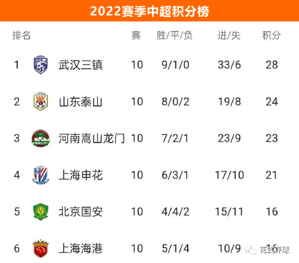 从第一阶段结束后的积分榜来看,武汉三镇28分比排名第二的山东泰山还多出4分,是最有可能夺冠的球队。其次是24分的山东泰山,比排名第三的河南嵩山龙门多出1分。申花拿21分排名第四。