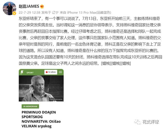 根据媒体人赵震的最新透露,就在扬科维奇带领国足选拔队踢东亚杯之前,他的父亲因病去世。得知情况后,足协方面希望扬科维奇先回国奔丧再赶去日本指挥比赛,但扬科维奇经过考虑,决定留下来带队踢东亚杯。