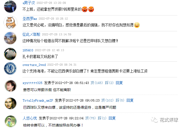 另一种观点则认为,要按合同办事,不能给对方白嫖的机会,就算是供着奥斯卡这几个月一场不踢,也不能让巴甲球队占便宜。评论区更多的球迷趋向于支持上港这一做法。