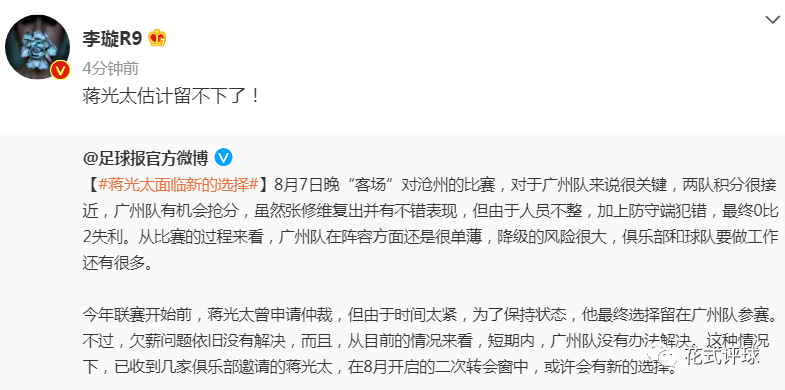 足球报的消息显示,蒋光太的欠薪问题还没有得到广州队的彻底解决,与此同时他已经收到几家俱乐部的邀请。这几家俱乐部分别是啥?足球报国内部主任李璇断定蒋光太大概率离队,她在个人社交平台上写道:“蒋光太估计留不下了!”(下图)