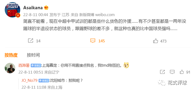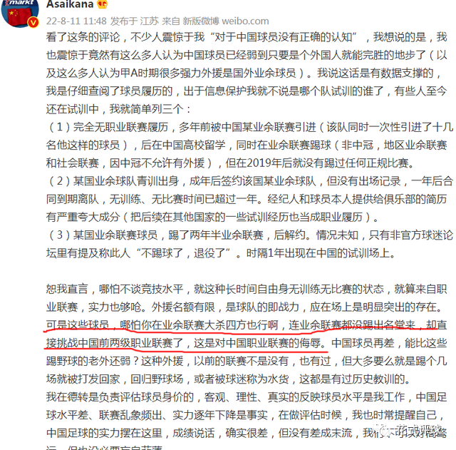 在评论区中,有球迷说朱艺对我们本土球员的水平没有正确的认知,对此朱艺进行了回应(下图)。朱艺不点名地列举出我们现在的3例外援引进,表示这3名所谓的外援都是业余球员出身,且都没踢过职业联赛,只是混迹于业余联赛。