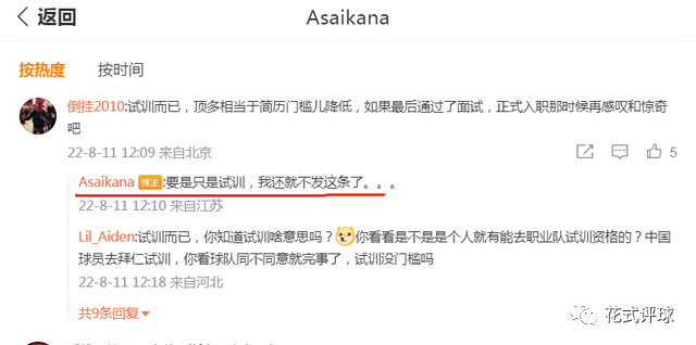 有球迷劝朱艺别大惊小怪,因为这只是试训而已。对此,朱艺留言回复道:“要是只是试训,我还就不发这条了......。”