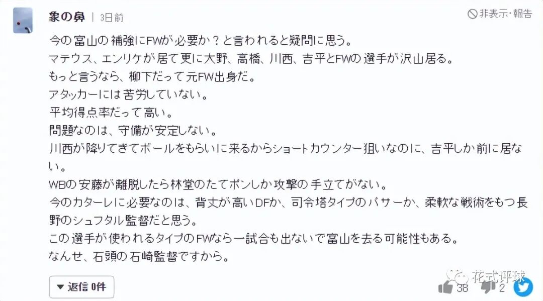 有支持就有泼冷水!有球迷留言认为(上图)富山胜利队根本不需要引进新的前锋,因为队内已经至少有6名前锋。而且球队的主要问题不在进攻端,而是防守不稳定。留言的最后,这位球迷下结论,认为陈彬彬“甚至有可能没有打一场比赛就离开富山”。