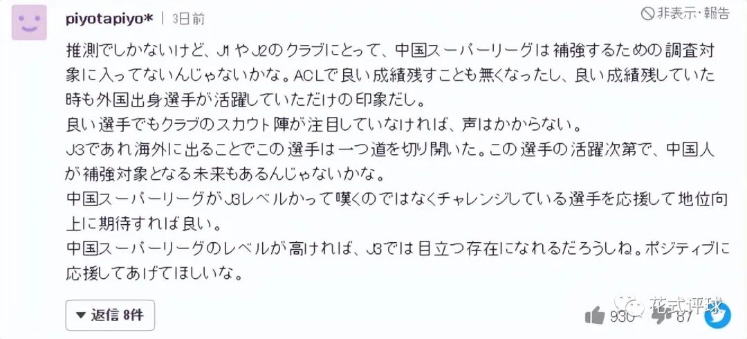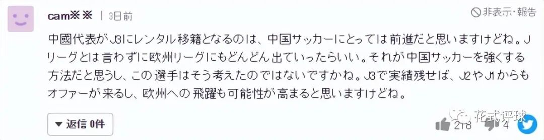 还有支持的日本球迷留言(上图),认为前中国国脚租借到J3是中国足球向前迈出的一步,而且如果陈彬彬在J3有良好的成绩,就会收到J2和J1的offer,将会增加留洋欧洲的可能性。