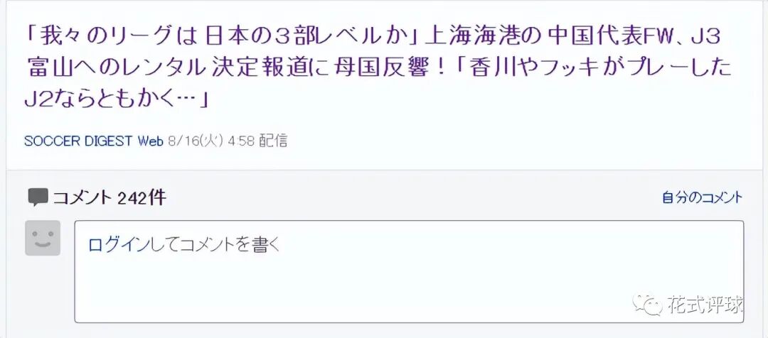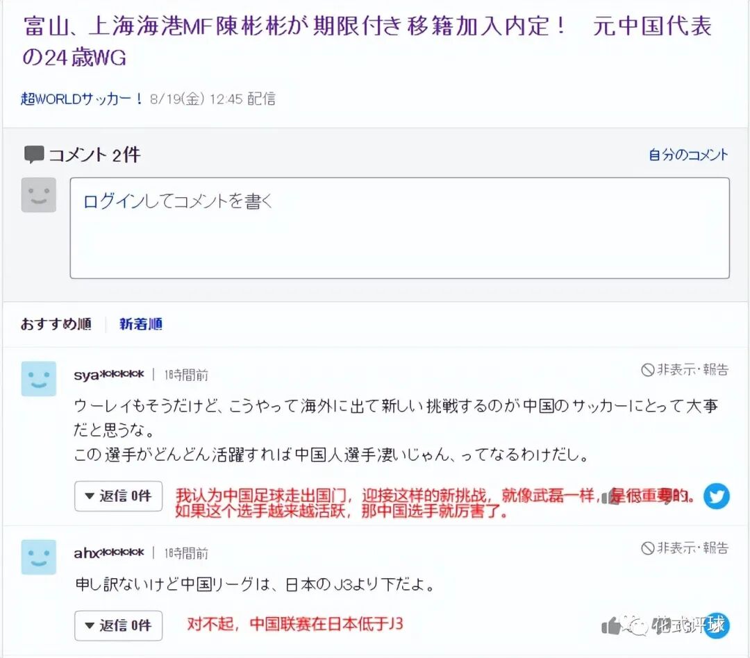 比如下面这篇文章(上图),仅有2条留言。第一个留言是鼓励他跟武磊一样迎接新挑战,另一个留言则认为中超联赛的水准低于J3联赛。