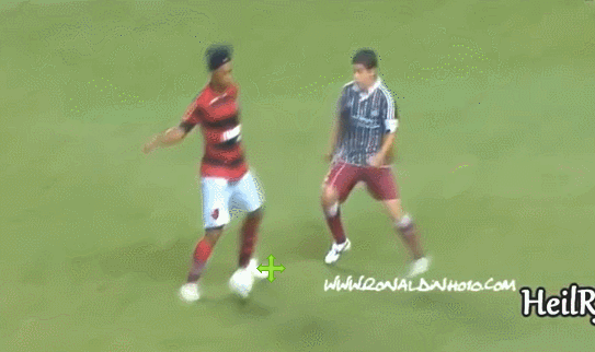 我们来看看同样是高空停球,小罗是怎么做的(上图)。小罗这个停球实在太精彩了,仅仅是用脚尖就把球稳稳地卸在自己的脚下,接着还晃过了孔卡的抢截。