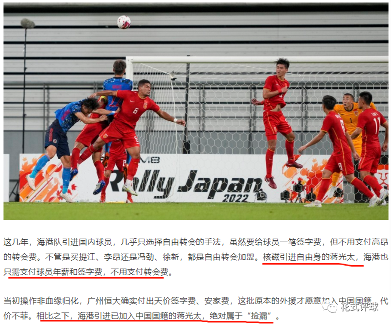 文章表示当广州队没钱让蒋光太无心踢球,这也影响了他在国家队的表现,而今他的到来,既让上港补强实力,又能“确保归化国脚没有后顾之忧”。