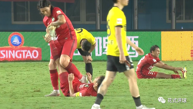 然而整场比赛踢下来,广州队却逼得对手球员多人抽筋。当主裁判吹响终场哨时,多名主队球员累趴在球场上,王上源等人抽筋倒地不起(上图)。