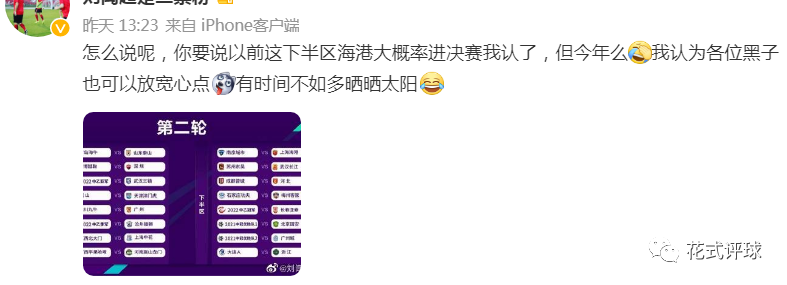 不过有记者却不认同这样的观点,沪媒东体首席记者刘闻超在个人社交平台上进行了驳斥(上图)。他写道:“怎么说呢,你要说以前这下半区海港大概率进决赛我认了,但今年么[允悲]我认为各位黑子也可以放宽心点[二哈]有时间不如多晒晒太阳[笑cry] ”