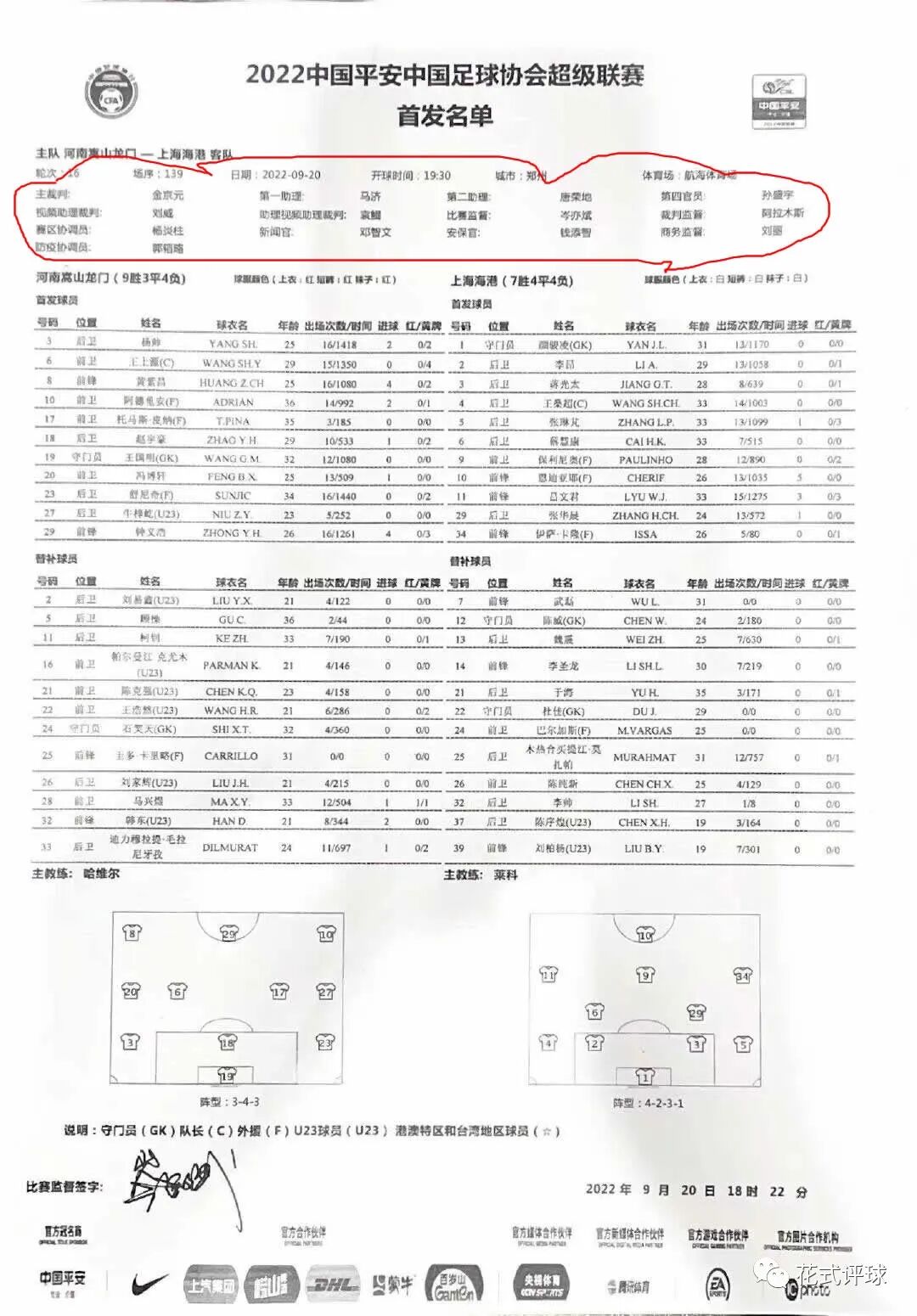 从画面来判断,这应该就是中超官方制作的赛前双方球员首发名单表。这张表的上部分,就是裁判的名单(下图)。