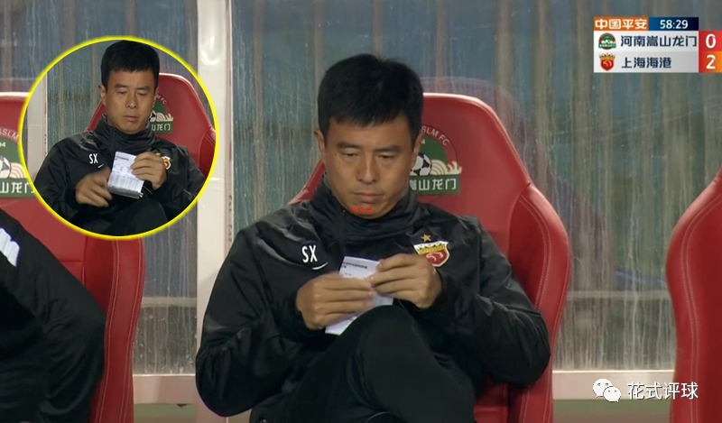染黄后孙祥有点闷闷不平地坐回了替补席,此时出现了很有意思的画面,导播很好地扑捉了这一镜头——只见孙祥突然从旁边拿出了一张纸,用双手抓着,专心致志地看着这张纸的上部分(下图)。