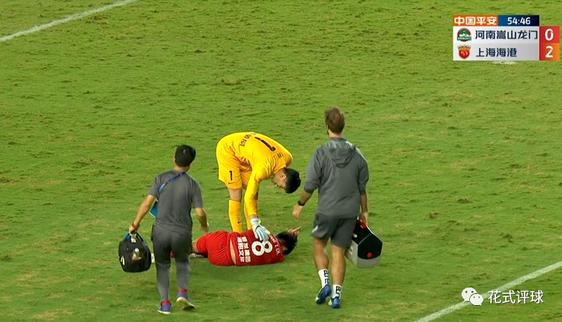 十几秒过后,当河南嵩山龙门球员发现黄紫昌还继续躺在对手禁区内时,集体不满地示意上港球员中断比赛,先让队医进场对黄紫昌进行治疗(下图)。