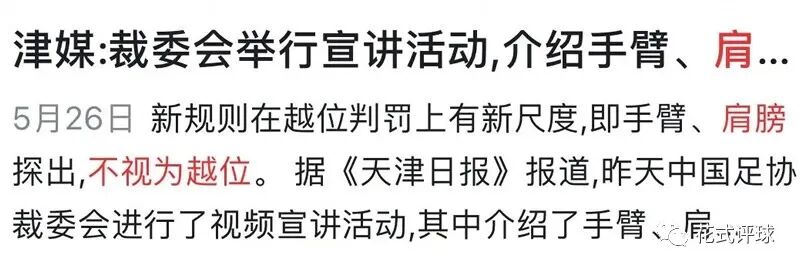 这个判罚看似有理,但根据足球新规,肩膀部位的探出不算是越位。有球迷找出5月26日的一篇新闻《津媒:裁委会举行宣讲活动,介绍手臂、肩膀探出不越位新规则》(下图),上面明确表示裁判委员会曾介绍过新规,球员的手臂和肩膀不算是越位部位。