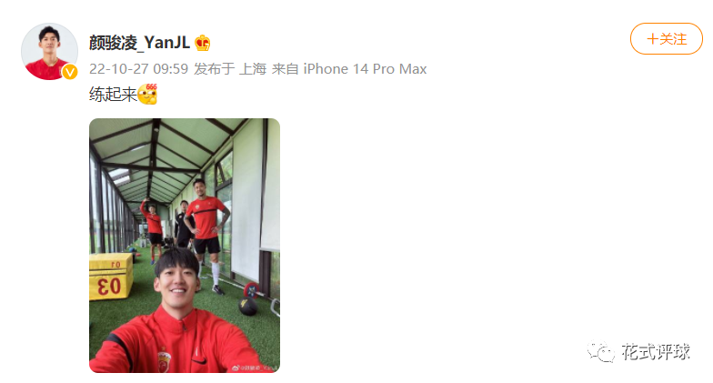原来,难得更新一次的上港门将颜骏凌在个人社交平台上开心地发表动态,写道:“练起来”。配图中他的身后站着张琳芃等人。这图暗示明显,意味着国脚张琳芃已经伤愈回归训练。