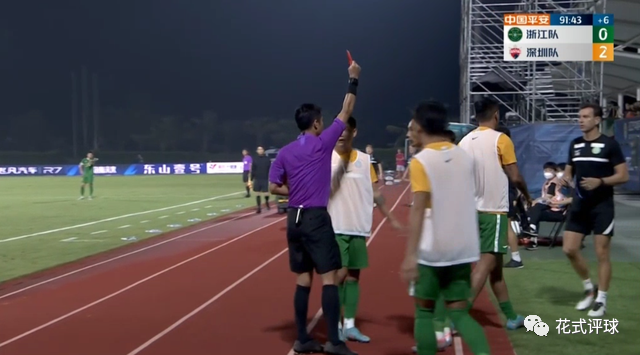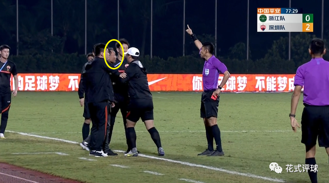 沈祥福为何被红牌的呢?比赛进行到第77分钟,深足有一名球员摔倒在浙江队禁区外,马宁吹停比赛准备去看望。意外!只见他走到半道突然折向另一个方向,狂奔了几十米跑向场边,并马不停蹄地向深足主帅沈祥福掏出了红牌(上图)。