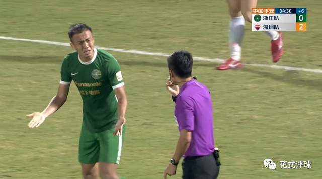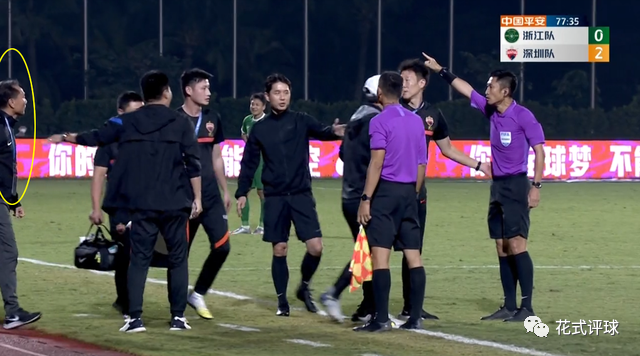 原来比赛进行到第76分钟时,深足球员在一次颇具威胁的传球中抢点时摔倒,马宁却示意让控球方的浙江队继续比赛(下图)。此判罚引起了在场边的沈祥福强烈不满!