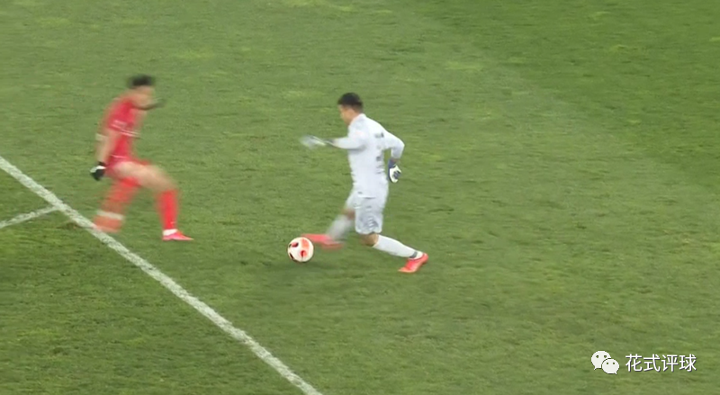 武磊这个降速假动作似乎迷惑了库迪热提。库迪热提本来在接球时是慢条斯理地踩着球往前一推,欲推开一定的空间来开大脚。也是库迪热提比赛经验不足,武磊这一加速逼抢让他猝不及防。
