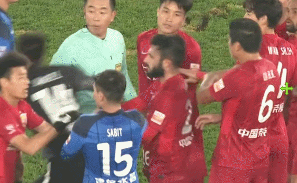 保利尼奥这种对人不对球队的动作立即引起了沧州雄狮球员的集体不满,纷纷上前指责。裁判也不失时机地立马赶到给保利尼奥出示黄牌一张。本来事情就应该结束,不料保利尼奥在走开过程中跟另一名沧州雄狮球员发生了肢体冲突(下图),一下子让事态严重。