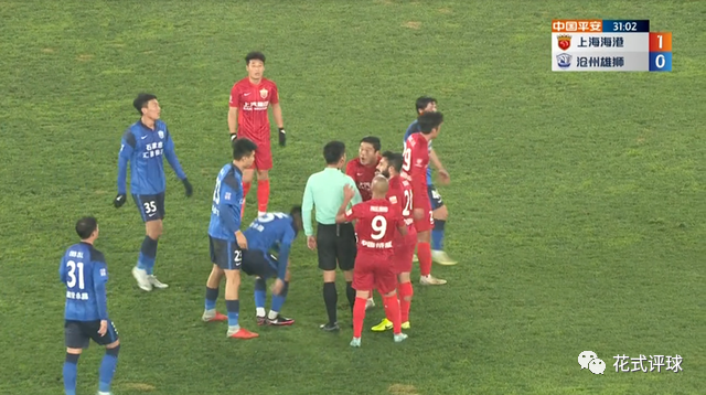 主裁判不依不饶维持原判,这也成为双方冲突的导火索。接下来双方球员的身体接触更加频繁,2分钟后终于酿成第一次冲突。第32分钟时,沧州雄狮攻到上港半场,保利尼奥在防守过程中先是推了一把沧州雄狮40号球员,接着又一脚把对手踢倒。