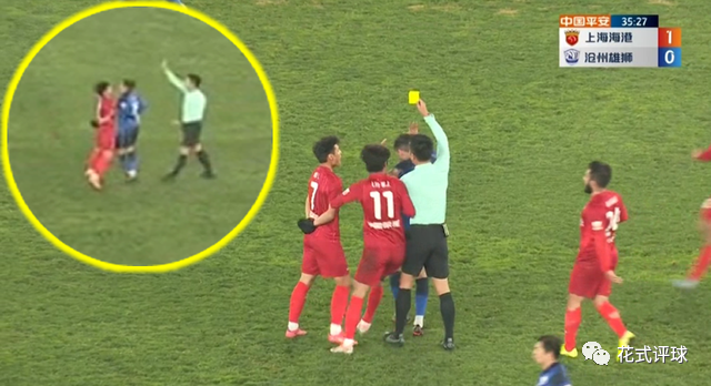 接着上港球员也踢倒了一名沧州雄狮球员。裁判把球权判给沧州雄狮,这也引起了上港球员的集体不满,蔡惠康和武磊等人上前找裁判理论(下图),认为对手的犯规在前,球权应该是上港的。