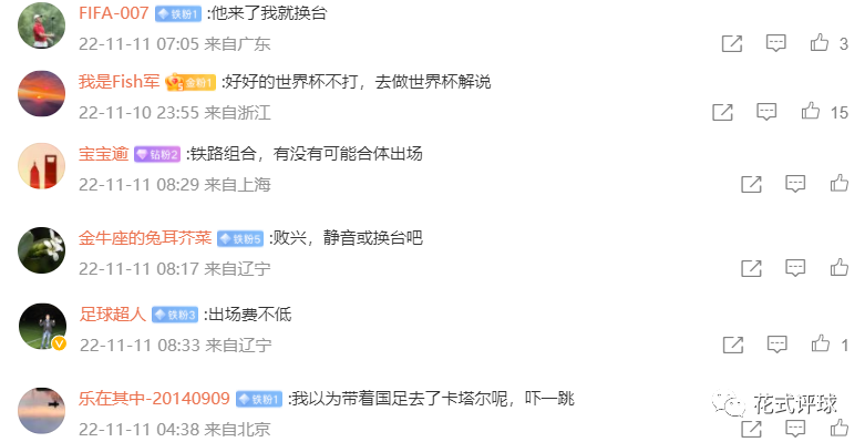 有球迷表示看到他解说就换台或静音。也有球迷很感兴趣,“铁路”组合会不会联袂出演。有网友留言,表示一看这图(本文第一张图)还以为他已经带着国足去了卡塔尔呢。有球迷感叹,他这次担任解说嘉宾,“出场费不低”。
