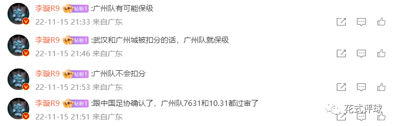 在足球报的这次直播当中,李璇在留言区透露了几个点(下图),她表示在跟足协确认后,11月前广州队都已经过审了。换句话来说就是这个时间点之前广州队不会被扣分。