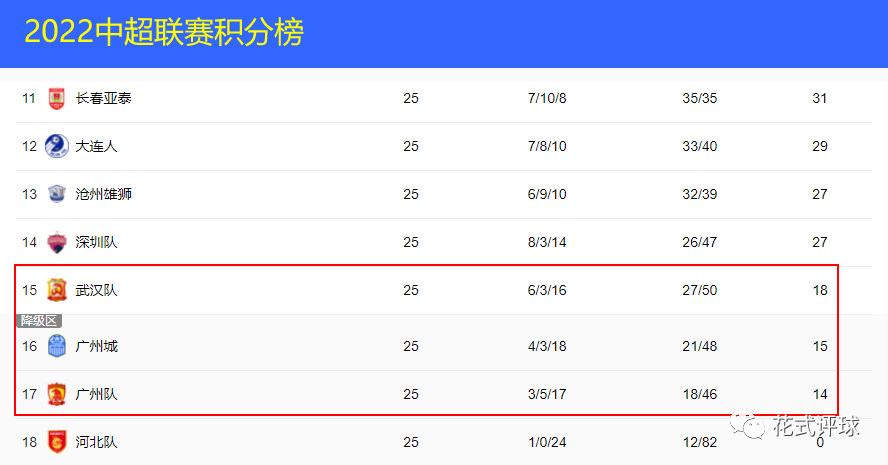 从积分榜来看,河北队已经预订1个降级名额,另外2个降级名额基本会在武汉长江,广州城和广州队之间产生。尤其是排名倒数第二的广州队,概率最大。