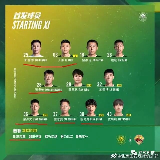 球队的替补阵容中还有球队主力高天意,前国足前锋王子铭,后面这两人也都有登场。总体而言,国安这套阵容并不差,至少比起前一天以4比2战胜中甲第六四川九牛的广州队U23阵容要强。