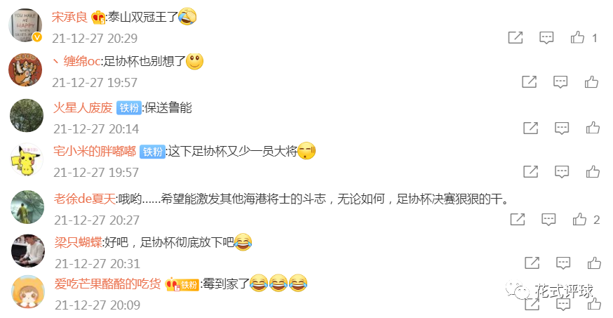 (上图)有海港球迷写道:“保送鲁能”,记者宋承良则留言:“泰山双冠王了”。显然,大家认为保利尼奥的伤退,等于保送山东泰山拿到足协杯冠军,双冠王稳了。