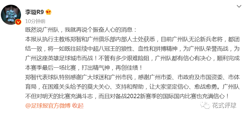 李璇在个人社交平台上写道:足球报从郑智和广州队内部人士处获悉,目前的广州队全体球员很团结,将延续八冠王的狼性和拼搏精神而为球队荣誉而战,球队有信心在最后一轮比赛中打出精神气(下图)。