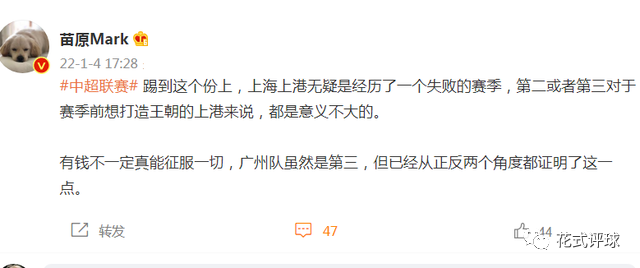 钱非万能,有钱不一定能买到一切!媒体人苗原在点评上港这个赛季时,一针见血地直言有钱的上港不能征服一切(下图)。