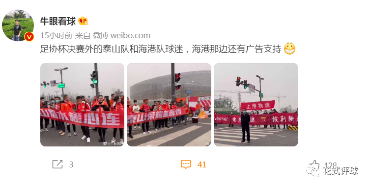 在个人社交平台上,他写道:“足协杯决赛外的泰山队和海港队球迷,海港那边还有广告支持 [坏笑]”。海港球迷还有广告支持?令人羡慕不已。
