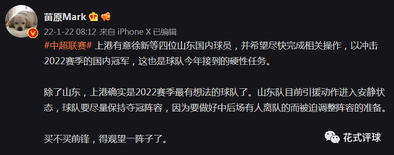 近日,媒体人苗原在个人社交平台(上图)上表示:“上港有意徐新等四位山东国内球员,并希望尽快完成相关操作,以冲击2022赛季的国内冠军,这也是球队今年接到的硬性任务。”