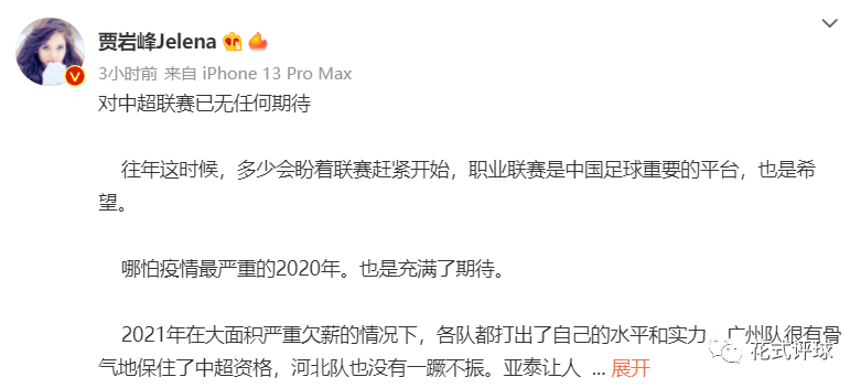 足球报记者贾岩峰在个人社交平台上发文,表示她对新赛季的中超联赛已经没有了任何期待,往年这个时间她都对新赛季充满期待,盼着赶紧开始。但现在很多球员都已经萌生退意,那些不想退的球员,也只是跟着随波逐流。