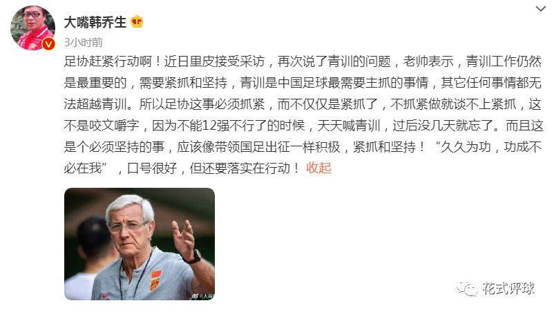 近日,前国足主帅里皮在采访中表示青训很重要,中国足球应该坚持不懈地搞青训。韩乔生对此有感而发,认为青训是中国足球最需要主抓的事情,足协不仅要紧抓还是抓紧去做。