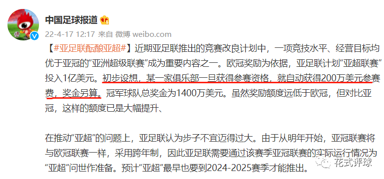 根据媒体的报道,虽然参赛收入远不如欧冠,但亚足联酝酿的这个亚超的参赛收入足以令如今的中超球队分外眼红。