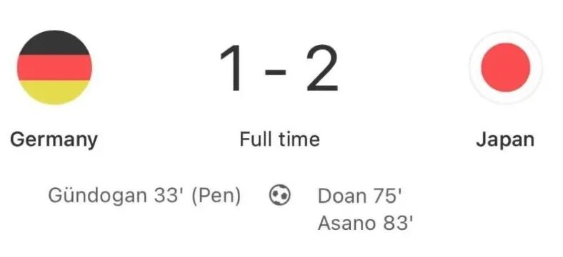 在刚刚结束的一场世界杯小组赛上,日本队在普遍不被看好,而且在上半场被疯狂压制的情况下,居然完成了不可思议的大逆转。在比赛第75分钟和第83分钟的时候,日本队分别进球。这两个进球进得相当不可思议,快如闪电,踢得德国队和德国球迷一脸茫然。这样的画面不由得让球迷想起之前沙特逆转阿根廷的情景。开局都是先丢了一个点球,最后在下半场的几分钟里火速反超。全场比赛结束,比分定格在了2-1!