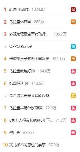 虽然在整场比赛中,双方踢得没有趣味,让人看得昏昏欲睡,但是球迷尤其是中国球迷却发现了别样的趣味。大家在观看的比赛中发现韩国队的一些球员的小动作真的是太多了。在与乌拉圭队拼抢的过程中,他们总能使一些令人厌烦的招数。比如努涅斯在带球的时候被罗相镐拉扯球衣,比如巴尔韦德在护球的时候被韩国球员搂脖子……不看不知道,一看真的让人意想不到。而这也引发了中国球迷的热议,没过多久关于韩国球员小动作的话题就登上了热搜第一名。