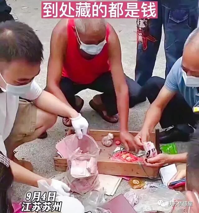 根据视频画面显示,亲属将老人所有遗物搬到外面,等到人齐了以后就开始整理,每个角落都是钱,现金装满了一个塑料袋,他们这些人还一边整理一边笑。