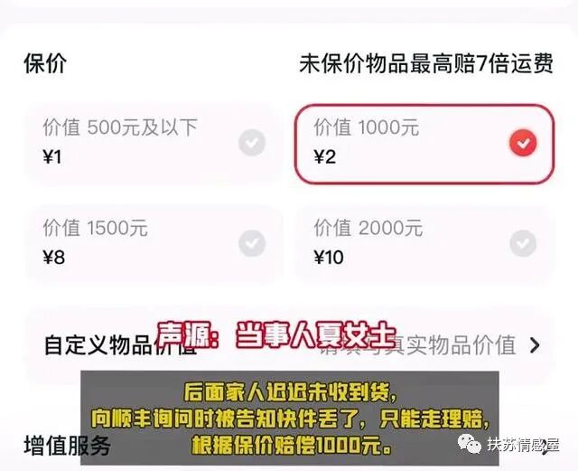 夏女士仔细查看才发现,当初勾选的2元保价,最高就是1000元,也就是说按照快递费的20倍赔偿,多的顺丰就不认了。