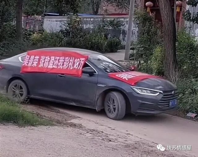 告上法院以后小伙仍不解气,于是又去做了横幅,上面写着吴景荣、张称盈还我18万彩礼,还拿着一个大喇叭在女方的村里转悠。