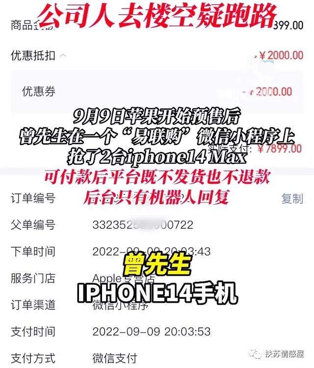 近日,据各大官方媒体报道,有网友爆料称在微信小程序易联购商城下单购买苹果手机,临近发货日期,却联系不上官方客服了。