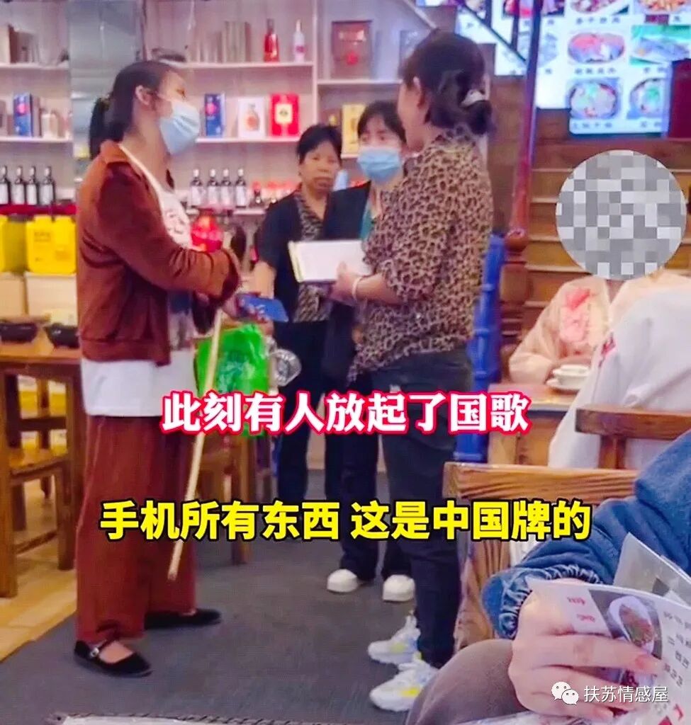 现在他们几个人争论时,店里面突然间就响起了国歌,这一幕显得非常应景,劝阻的女子说我们勿忘国耻,如今的生活都是先辈用血换来的。